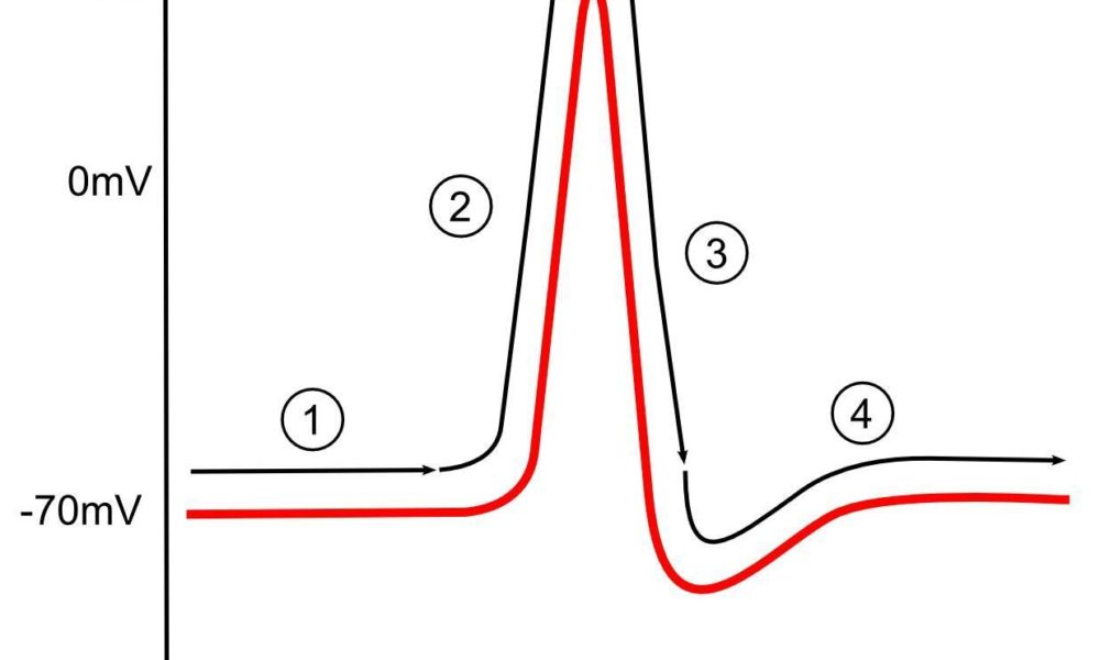 19. На изображении представлены различные стадии потенциала действия нейрона. Во время стадии 2 происходит