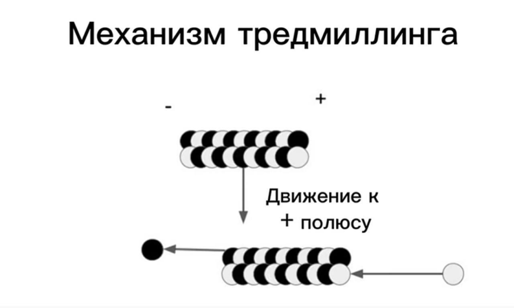 3. Тредмиллинг (Treadmilling) — это динамический процесс, при котором структурные единицы некоторого компонента клетки добавляются преимущественно на одном конце и удаляются с другого конца с примерно одинаковой скоростью. Выберете, какой компонент клетки, схематично изображённый на рисунке, вовлечён в данный процесс.