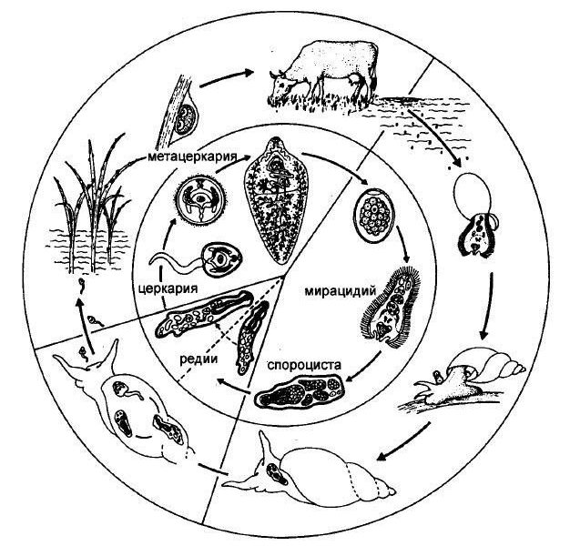 8. На изображении представлена схема жизненного цикла печёночного сосальщика (Fasciola hepatica) — типичного объекта изучения в школьном курсе биологии. На какой стадии происходит заражение промежуточного хозяина?
