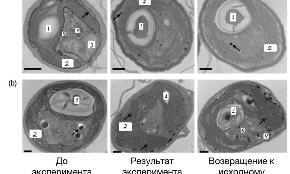 5. В биологической лаборатории ученые исследовали реакцию живых клеток на стресс. В качестве объектов были взяты близкородственные виды из пруда (a) и почвы (b). Под цифрами 1 зашифрован пиреноид, содержащий РуБисКО – главный фермент фотосинтеза, 2- хлоропласт, под цифрами 3-6 показаны мембранные органоиды. Водоросли a и b были лишены на некоторое время важного абиотического фактора. Выберите какой организм сохранял наилучшие показатели жизнеспособности в ходе эксперимента?