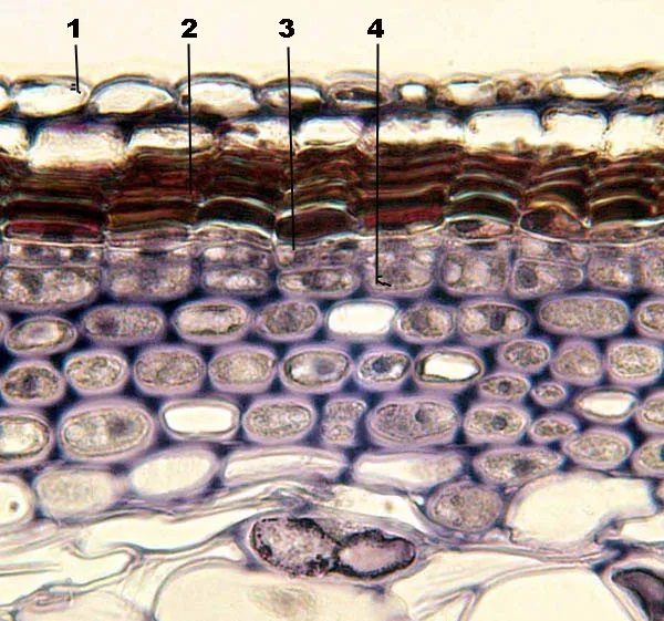 5. На микрофотографии представлен поперечный срез покрытосеменного растения. Проанализируйте гистологическую структуру и определите, к какой группе растительных тканей относится ткань, обозначенная цифрой 2.