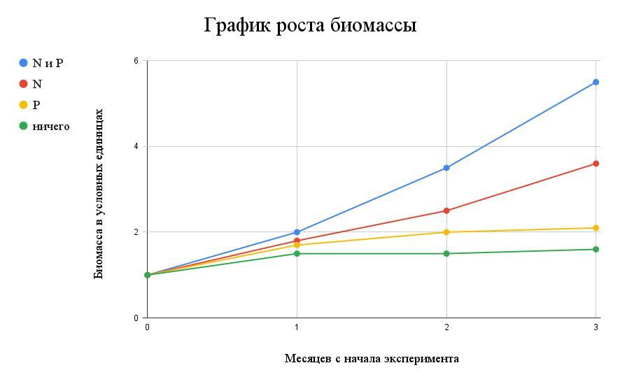 13. Вам стало интересно узнать, как различные удобрения в действительно “полевых” условиях могут влиять на урожай пшеницы. Вы разделили участок земли на четыре равных участка, после чего добавили азот и фосфор в нужных количествах на участок 1 (обозначен N и P) , добавили только азот на участок 2 (N), только фосфор на участок 3 (P), и ничего не добавили на четвертый участок. Каждый месяц после начала эксперимента вы оценивал биомассу каждого из четырех участков. График роста биомассы показан ниже. Выберите верное утверждение: