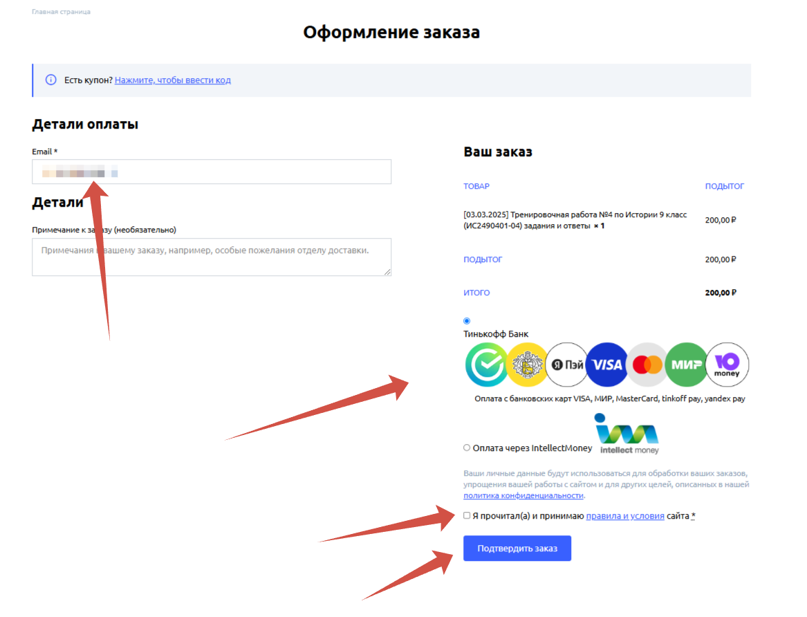 Шаг 7. Вводим свою электронную почту «Email», выбираем удобный Вам способ оплаты, читаем правила и условия, нажимаем «Подтвердить заказ».