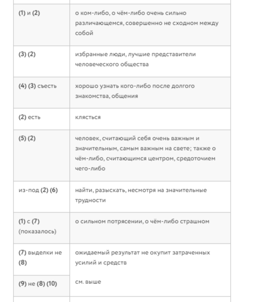 Саша выписал себе в таблицу 10 фразеологизмов и их значения. Затем из состава фразеологизмов выбрал 10 слов и пронумеровал их, а затем сами слова стёр. Вот, что получилось