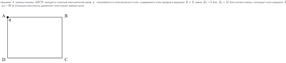 15. Какой станет напряжённость поля в вершинах B и D , если в вершину C дополнительно поместить такой же точечный заряд q , как и в вершине A ? Дайте ответ в В/м с округлением до десятых долей.