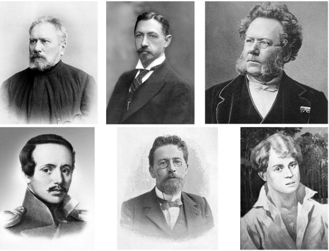 13. Соотнесите название произведения и портрет автора. Произведения: «Железная воля», «Пер Гюнт», «Окаянные дни», «Штосс», «Медведь».