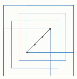 Задание 6. Демьян выкладывает картонные квадраты 2×2 вдоль диагонали квадрата 3×3 следующим образом: сначала по одному квадрату прикладывает к двум противоположным углам, а остальные равномерно выкладывает вдоль диагонали между первыми двумя (то есть центры квадратов делят отрезок между центрами крайних квадратов на равные отрезки). На рисунке показан пример для четырёх квадратов, которые покрывают область площади 23/3 .