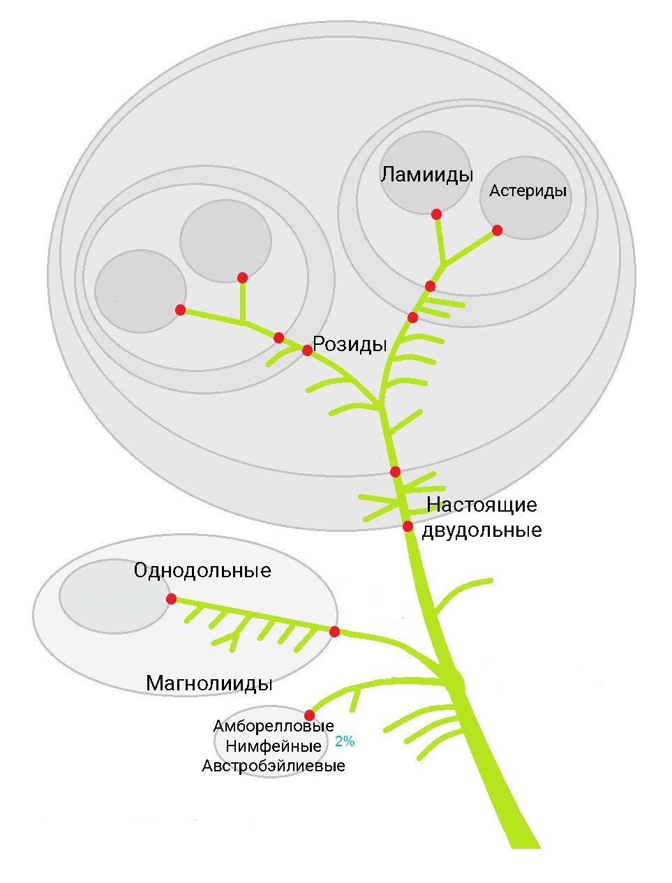 Задание 32: Перед вами современный, но немного упрощённый вариант филогении цветковых растений.