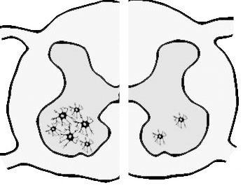 Задание 30: Дано схематичное изображение спинного мозга здорового человека (слева) и пациента с давним тяжелым неврологическим заболеванием (справа).