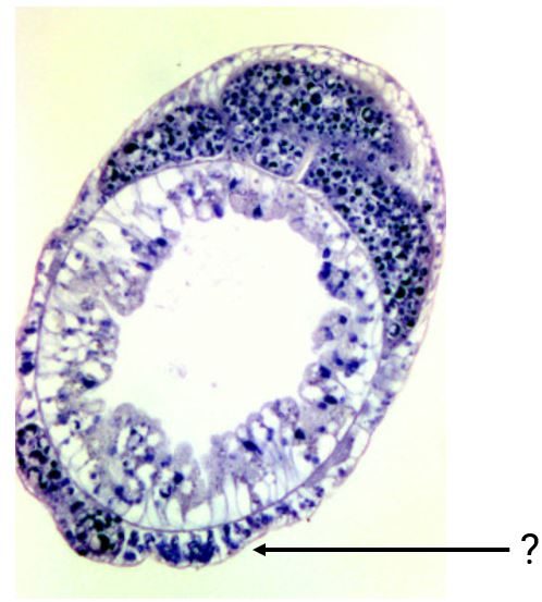 3. На занятии ребята рассматривали под микроскопом поперечный срез гидры. Учитель спросил: «На какой слой тела животного указывает стрелка и каковы его особенности?». Аня предположила, что это эктодерма, основная функция которой ищеварение. Арсений считает, что это энтодерма, содержащая нервные клетки. Арина сказала, что обозначена эктодерма и она состоит из разных типов клеток. Амир утверждает, что это мезодерма, которая обеспечивает движение. Кто из ребят прав?