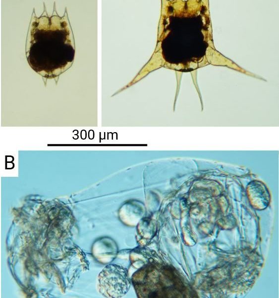 Задания 14: Цикломорфоз сезонная изменчивость морфологии особей разных поколений одного вида, характерная для мелких планктонных беспозвоночных. На изображении представлены особи поколений разных сезонов одного вида коловратки.
