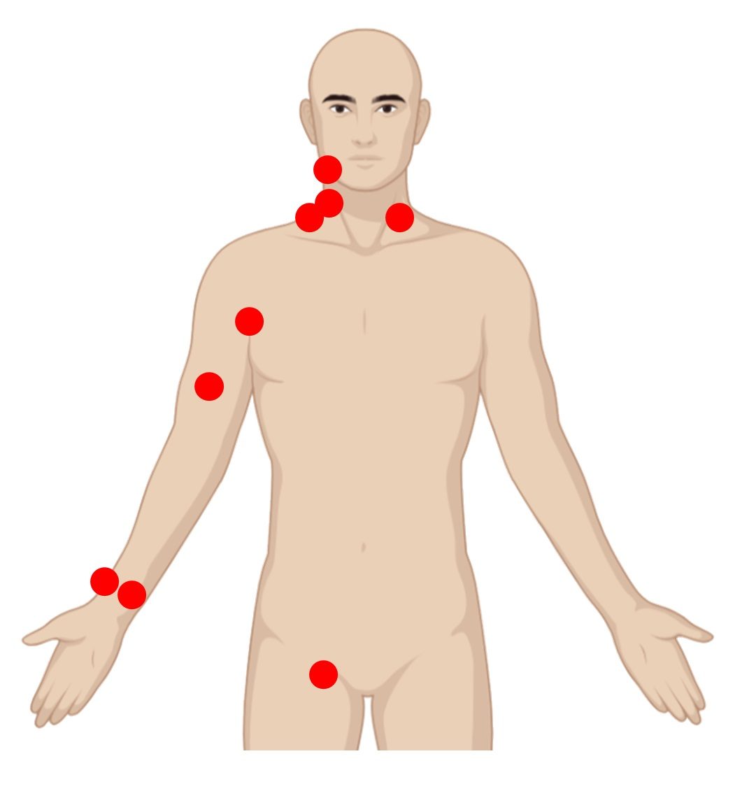 Задание 6: Места пережатия сосудов при кровотечениях соответствуют областям…