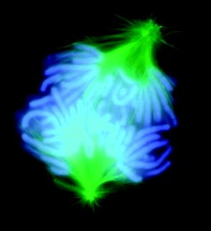 Задание 15: Перед вами изображение делящейся клетки животного, полученное при помощи флуоресцентного микроскопа.