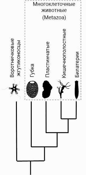 Задание 29: Дано филогенетическое древо, отражающее взаимоотношения между современными многоклеточными животными и их родственниками.