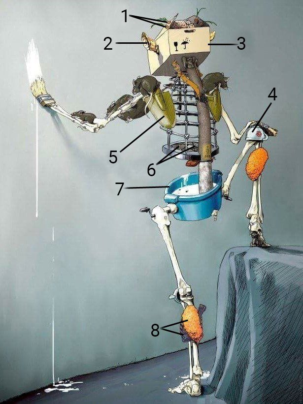 Раскройте «игру слов» и соотнесите предметы, из которых составлен «человек» на шуточном рисунке, с анатомическими терминами. Затем установите соответствие между разгаданными структурами и группами органов, к которым они относятся.