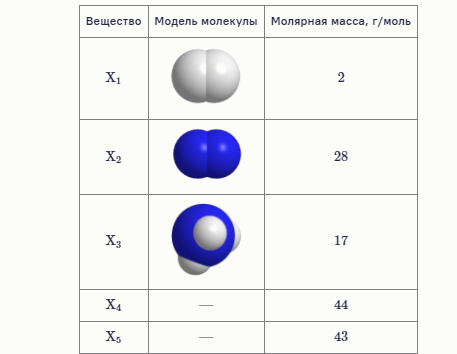 Вещества X1 X5 имеют молекулярное строение. Ниже представлены масштабные модели молекул первых трёх из этих веществ, «шариками» одного цвета обозначены атомы одного и того же химического элемента. Вещества Y1 Y3 имеют ионное строение.