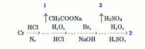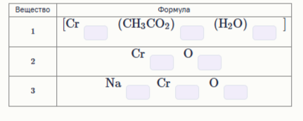 Известно, что: комплексное соединение 1 1 содержит четверную связь Cr Cr ω(Cr)=27.64 %; бинарное соединение 2 обладает синей окраской (Cr)=39.39 %); оранжевое соединение 3 содержит хром в степени окисления +6. Расставьте индексы в формулах соединений.