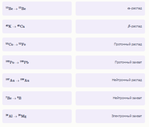 Задание 9. Ядерные реакции традиционно рассматривают в рамках физики, но, как говорится, химия это самая сложная физика. Установите соответствие между ядерными превращениями и их типами. На схемах не указаны протоны, нейтроны, электроны и альфа‑частицы. Примечание: В ходе протонного/нейтронного распада из ядра испускается протон/нейтрон соответственно и образуется новое ядро. Пример нейтронного распада: 5He→ 4He+n0. В ходе протонного/нейтронного/электронного захвата ядро присоединяет один протон/нейтрон/электрон соответственно и образуется новое ядро. Пример электронного захвата: 13N+e→ 13