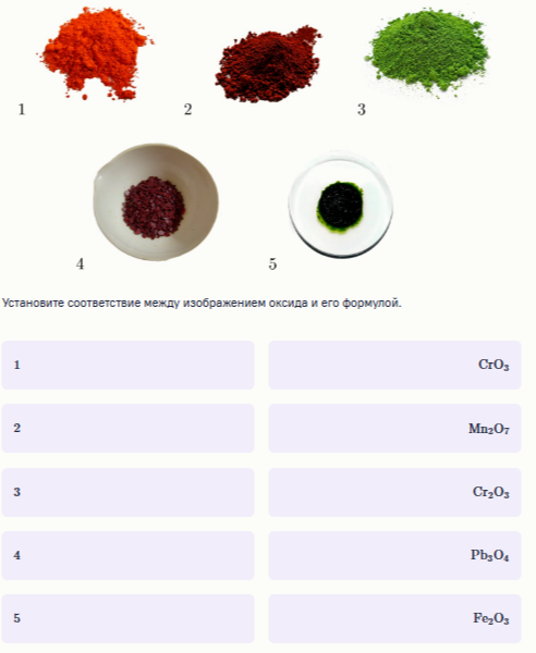Задание 8. Оксиды бывают разные чёрные, белые, красные. Но всем одинаково хочется, чтобы вы их узнали. Известно, что 4 и 5 сильные окислители, оксиды 1 и 2 встречаются в природе в виде минералов, а оксид 3 один из продуктов реакции в популярном химическом опыте.