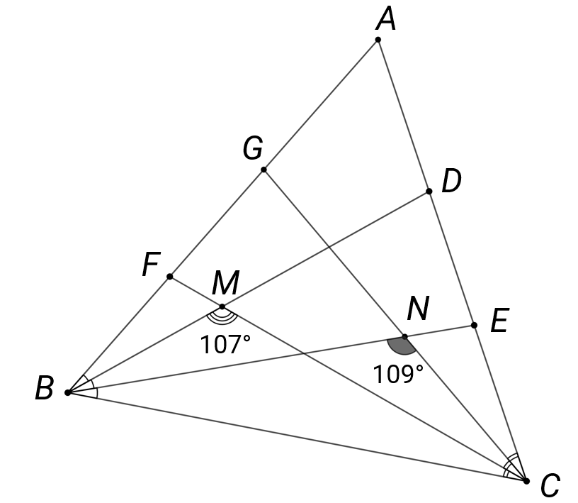 Задание 6: В треугольнике ABC отрезки BD и BE делят угол ∠ABC на три равные части. Отрезки CF и CG делят угол ∠ACB на три равные части. Отрезки BD и CF пересекаются в точке M, а отрезки BE и CG пересекаются в точке N. Известно, что ∠BMC=107∘, ∠BNC=109∘. Найдите углы треугольника ABC. ∠ABC=∠BAC