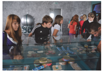 На фотографии изображена группа школьников на экскурсии в музее. Ребята стоят у стеклянной витрины и внимательно рассматривают экспонаты: внутри лежат упаковки и тюбики с пищей, похожие на «космическую еду». Видно, что это музейный зал: аккуратный интерьер, выставочные витрины, экспонаты расположены так, чтобы их удобно было рассматривать.