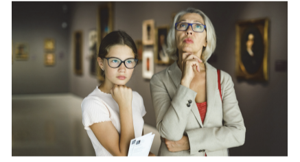 На фотографии изображены две посетительницы картинной галереи: взрослая женщина и девочка-подросток. Они стоят в зале, на стенах видны картины в рамках, а сами героини выглядят задумчивыми: одна держит руку у подбородка, будто размышляет, другая внимательно смотрит вперёд.