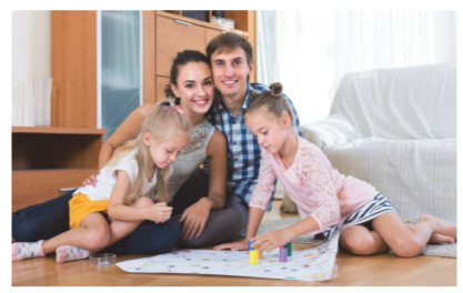На фотографии изображена семья: мама, папа и двое детей. Они находятся дома, в уютной комнате, на полу возле дивана. Взрослые и дети вместе играют: на коврике лежит развивающая игрушка, дети что-то строят или раскладывают детали, а родители рядом — помогают и наблюдают.