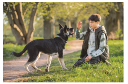 На фотографии действие происходит на улице, в парке или в сквере: вокруг зелёная трава, деревья, солнечный день. Юноша присел на колено на тропинке и занимается дрессировкой или игрой с собакой: он поднял руку, как будто даёт команду, а другой рукой может держать лакомство.